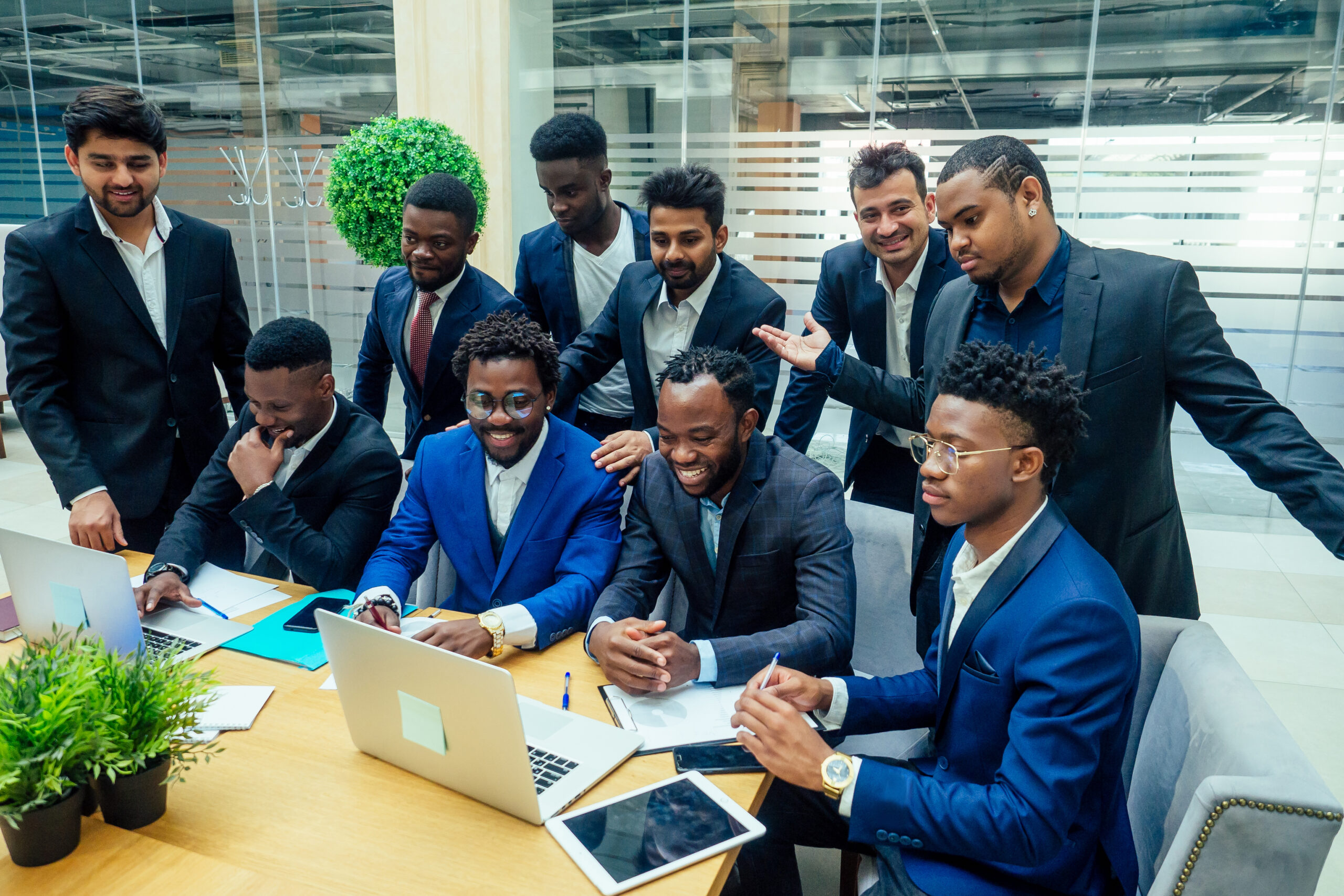 Face of handsome african business man, holding laptop on the background of business peoples multiracial team meeting, sitting in office table.